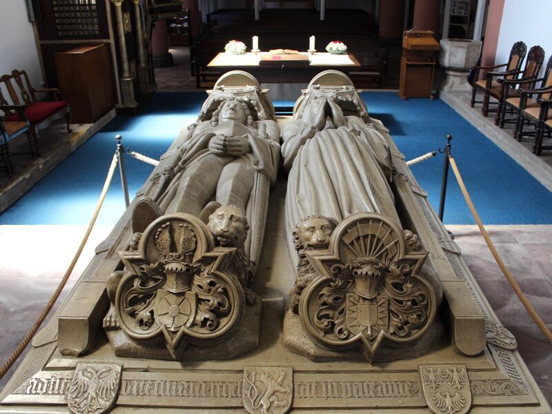 Die liegenden Figuren des Stifterehepaares sind in voller Größe dargestellt, beide mit betenden Händen.