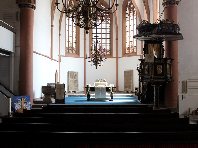Der erste Eindruck vom Kircheninneren ist der einer fast erhabenen Schlichtheit.Vier mächtige Säulen tragen den aus dreijochigem Mittelschiff und entsprechenden Seitenschiffen gebildeten, fast quadratischen Raum, dem sich nach Osten der Chor mit dem gewohnten Fünfachtel-Abschluß anschließt.Die Schlußsteine der Kreuzgewölbe zeigen im Chor das Lamm Gottes